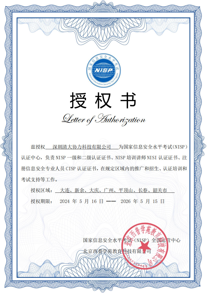 国家信息安全水平考试(NISP)报名助考网站是深圳清大协力科技有限公司运营的官方平台,专注于为广州以及珠三角地区的信息安全专业人士提供全面的考试服务。作为NISP的认证中心,本网站在授权期限内(2024年5月16日至2026年5月15日)负责以下服务: